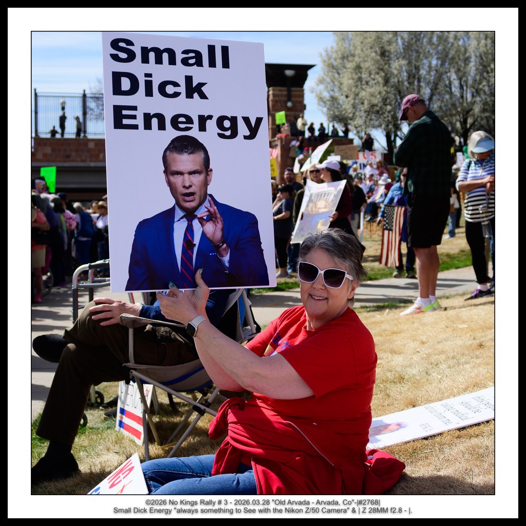 At the No Kings Rally in Arvada, Colorado on March 28, 2026, this woman sat comfortably in her chair, relaxed and smiling, holding her “Small Dick Energy” sign featuring Pete Hegseth with the quiet confidence of someone who has already won the argument.