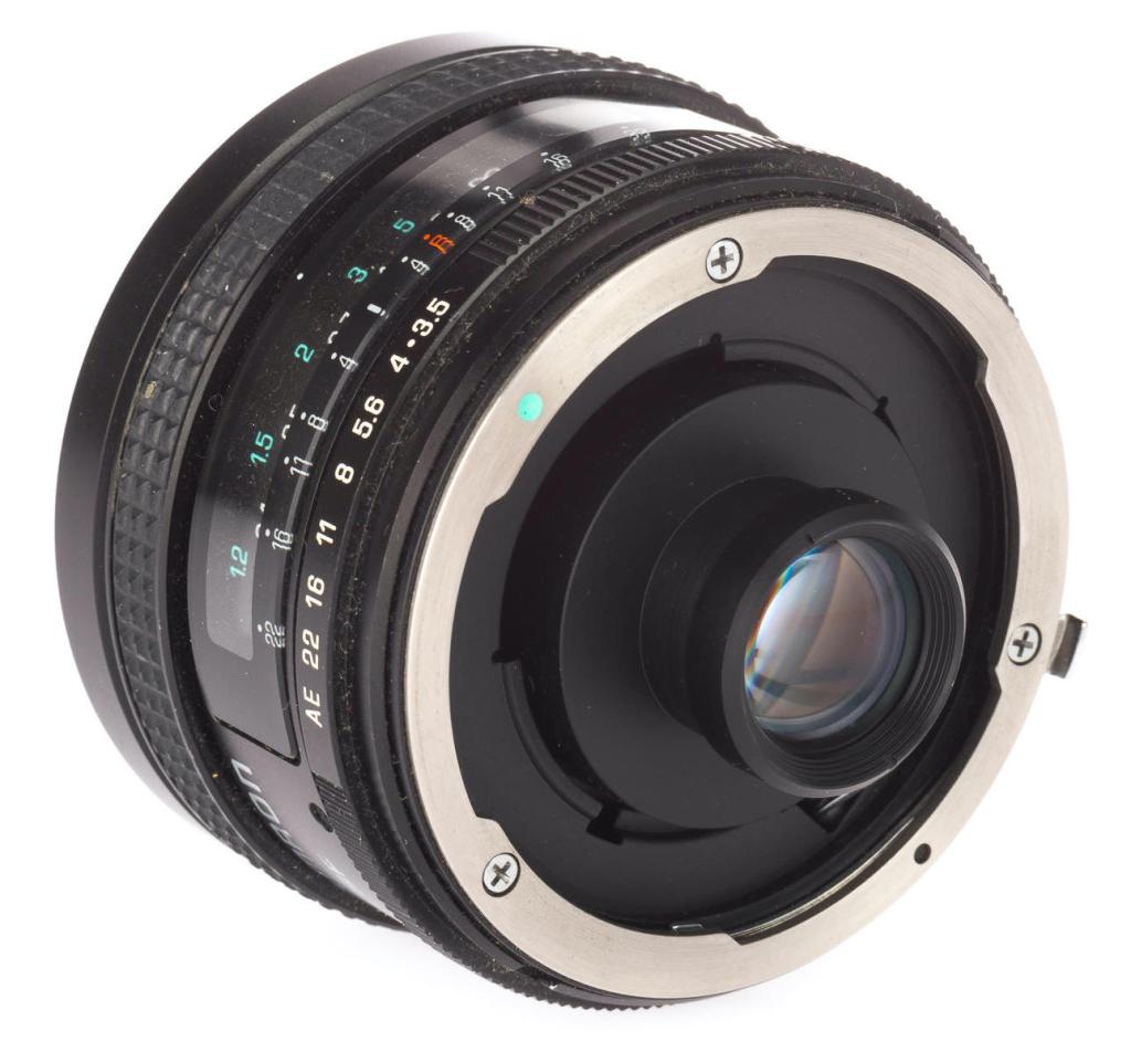 Tamron SP 17mm F/3.5 Models 51B and 151B: A very good ultra wide angle lens with excellent sharpness and contrast across the film plane, except in the extreme corners at wider apertures. Performance is slightly to moderately soft towards the corners wide open at F/3.5, improves at F/4, is very good by F/5.6, and is excellent between F/8 to F/16. The early version (model 51B) of this lens had built-in filters for black and white photography and thus are highly sought after items. The later version (model (151B) features a cosmetic redesign and discarded the built-in filters as a cost savings measure. Distortion is well controlled (about 1%) except that the this distortion is non-linear and varies from a very slight pincushion to a very slight barrel from about 40% off-axis to about 70% off-axis. Yet distortion along all four edges of the film plane is almost non-existent. The only real advantage which a better OEM lens might possess is better control of non-linear distortion.